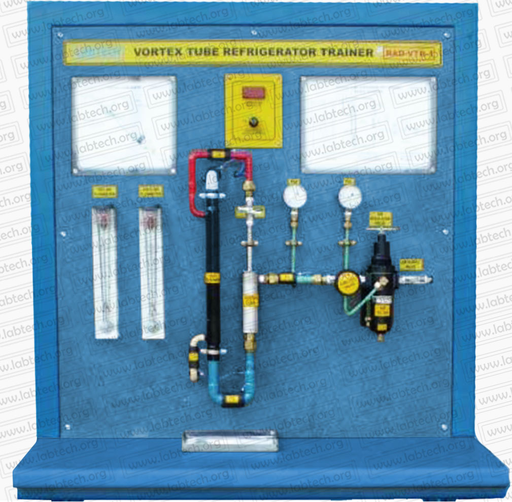 This trainer is designed to do demonstration of principle to produce hot & cold air from a device with no moving parts. Calculate of performance curves for a vortex tube with variation of inlet pressure, hot and cold gas ratios and gas (if available). Determine of refrigeration effect & comparison of this with the estimated power needed to drive the compressor.